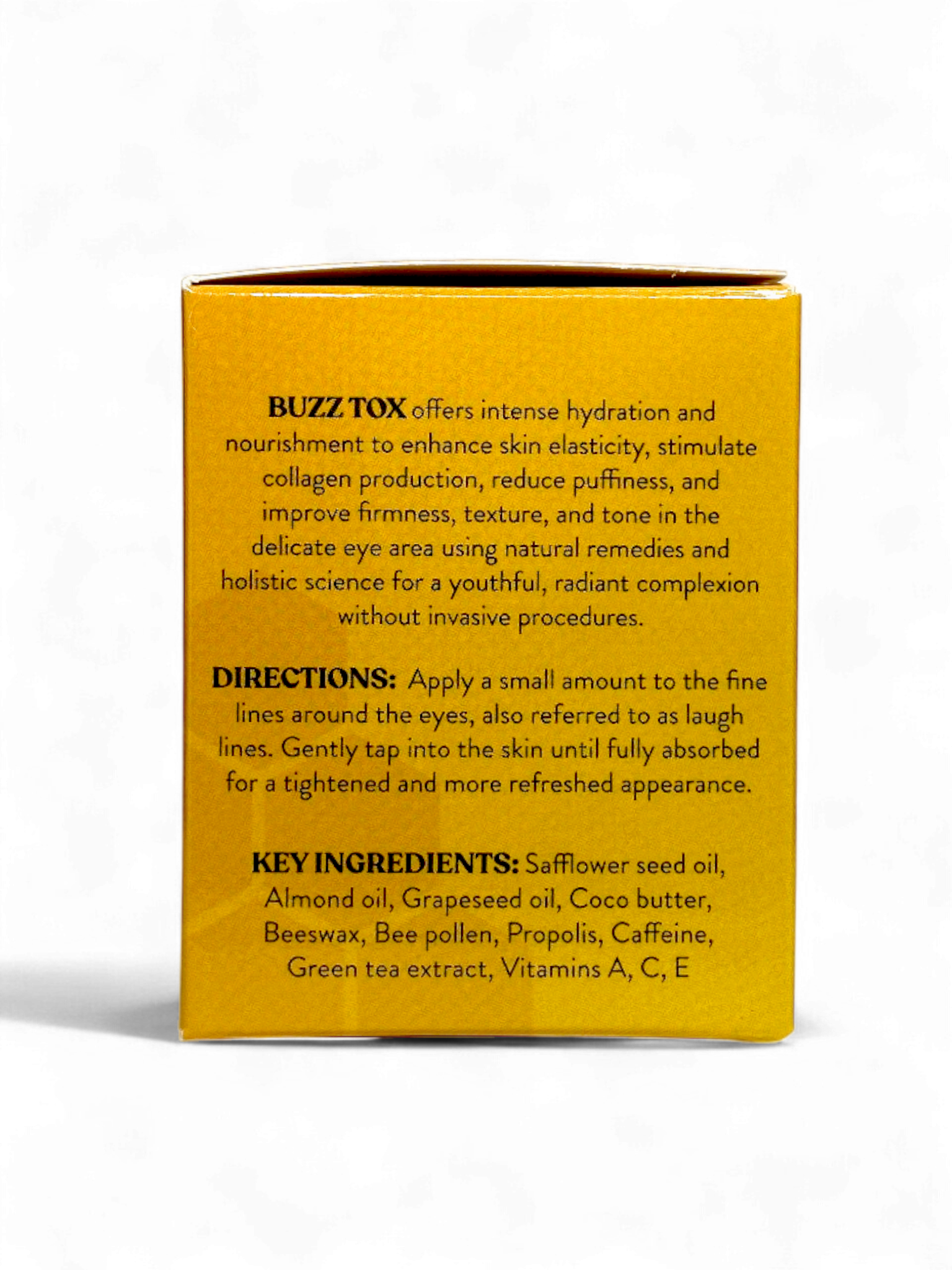 BUZZ TOX is a bee-powered eye and expression-area balm designed to hydrate, smooth, and visibly refresh delicate skin. This targeted treatment helps improve the appearance of puffiness, fine lines, and texture for a more rested, radiant look—without invasive procedures.
