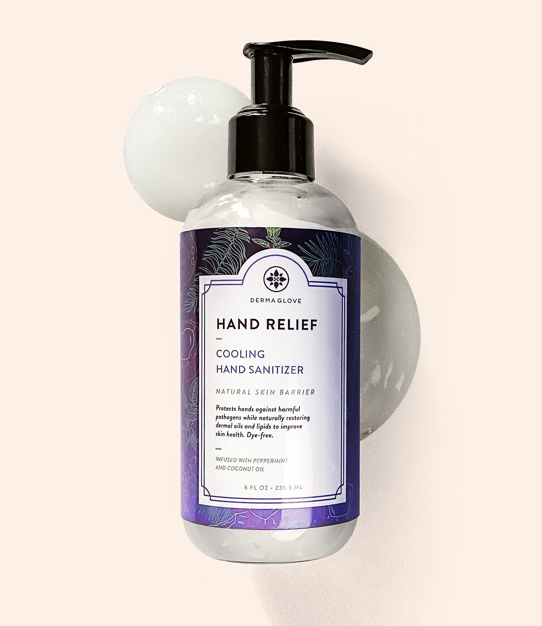 HAND RELIEF is a peppermint-infused hand gel sanitizer that cleanses, cools, and comforts dry, irritated hands while eliminating 99.9% of common bacteria.