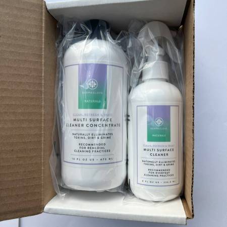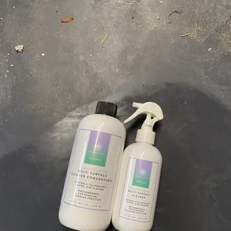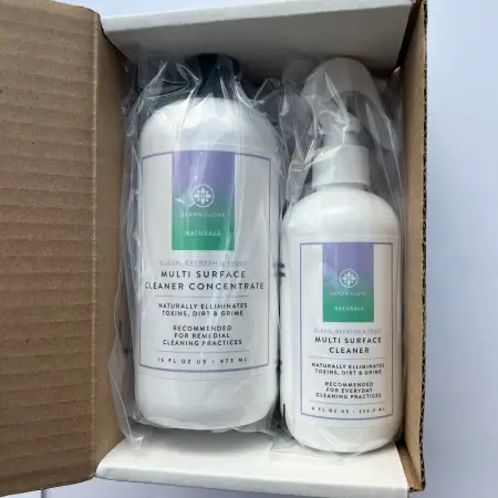 A complete refill system featuring one reusable spray bottle and one concentrate bottle for long-lasting, surface-restoring home hygiene.