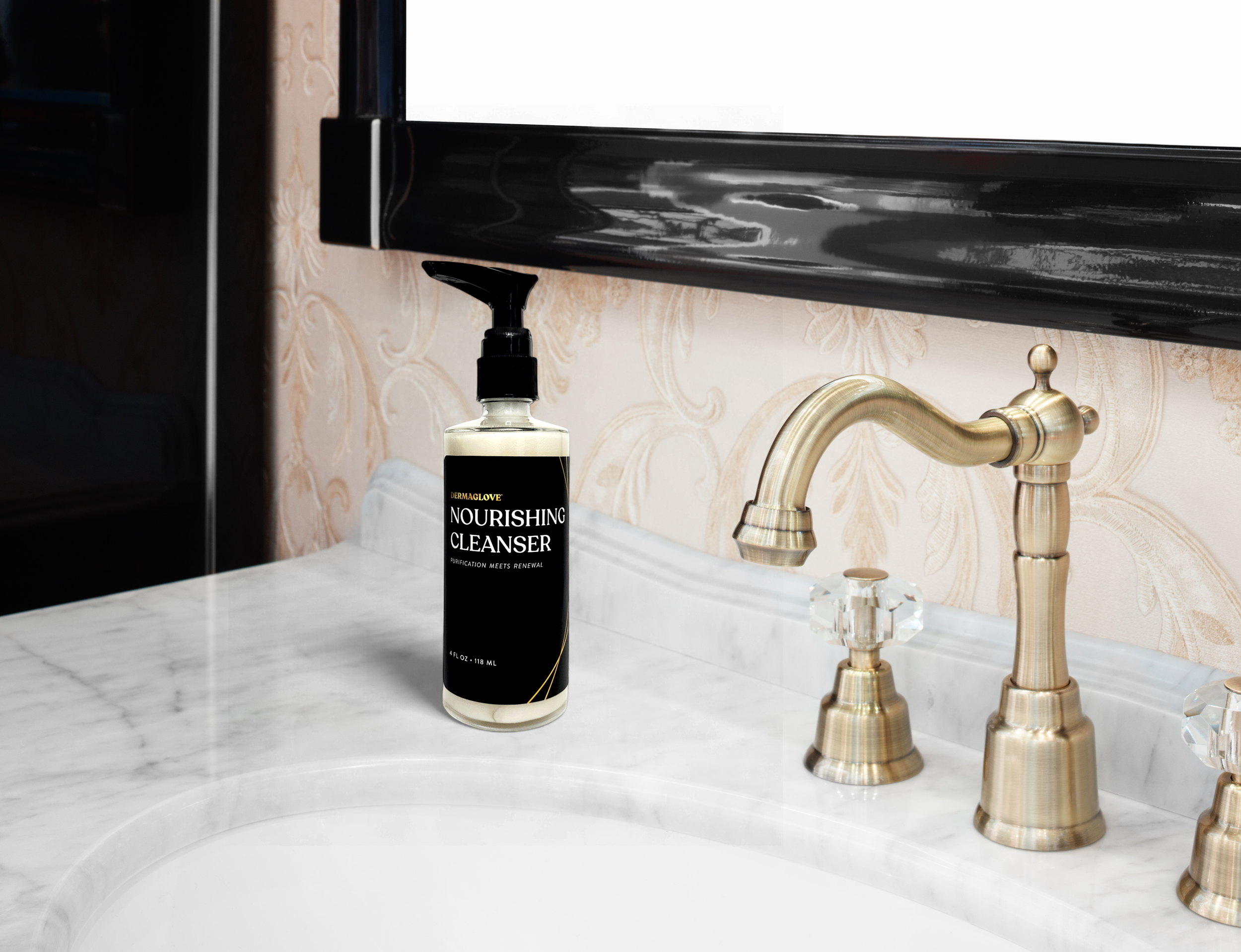 LuxeSkin Nourishing Cleanser is a gentle daily facial wash formulated with green and white tea, rose essence, and vitamins A, C & E to purify, hydrate, and renew the skin. Clean, vegan, and non-toxic in a 4oz glass bottle.