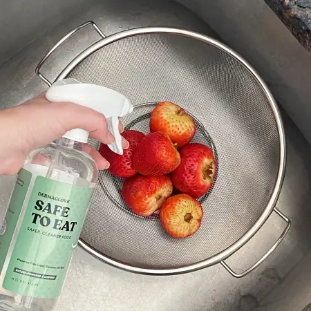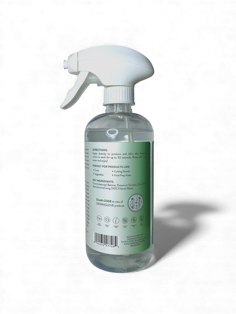 Spray foam directly onto produce or food-contact surfaces. Allow foam to cling for 30–60 seconds. Rinse thoroughly with clean water. Safe for daily use on fruits, vegetables, cutting boards, countertops, and prep areas. Always follow standard food-handling practices.