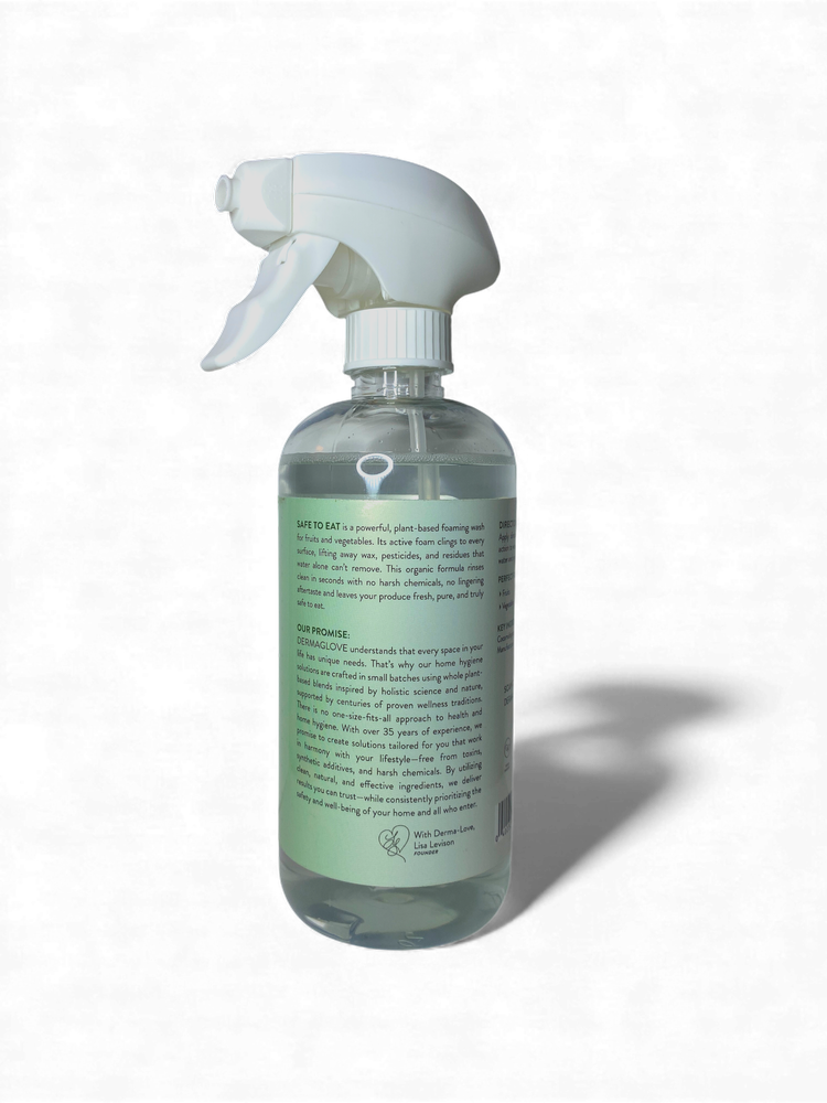 Why Choose SAFE TO EAT Foaming Spray? Because food hygiene deserves more than a quick rinse. SAFE TO EAT Foaming Spray was originally formulated for commercial kitchens, food prep areas, and agricultural handling environments—then thoughtfully adapted for everyday homes. What makes it different is its controlled foaming action, which allows the formula to cling to produce and surfaces longer, increasing contact time and cleaning effectiveness without scrubbing or chemical exposure. Powered by plant-based coconut and citrus surfactants, the foam gently lifts wax coatings, dirt, pesticides, and unseen residues from fruits, vegetables, and food-contact surfaces. At the same time, INVIS-O-BOND Technology creates a micro-thin, invisible barrier that helps protect surfaces after cleaning—without leaving films, fragrances, or chemical residue behind. Unlike traditional produce washes or sanitizers, SAFE TO EAT does not rely on harsh acids, chlorine, or alcohol. It is paraben-free, naturally scented, aquatic-safe, and cruelty-free, making it safe for kitchens, families, pets, and the environment. This ready-to-use foaming spray supports clean living, food safety, and peace of mind—because what touches your food should be as thoughtful as what goes into your body.